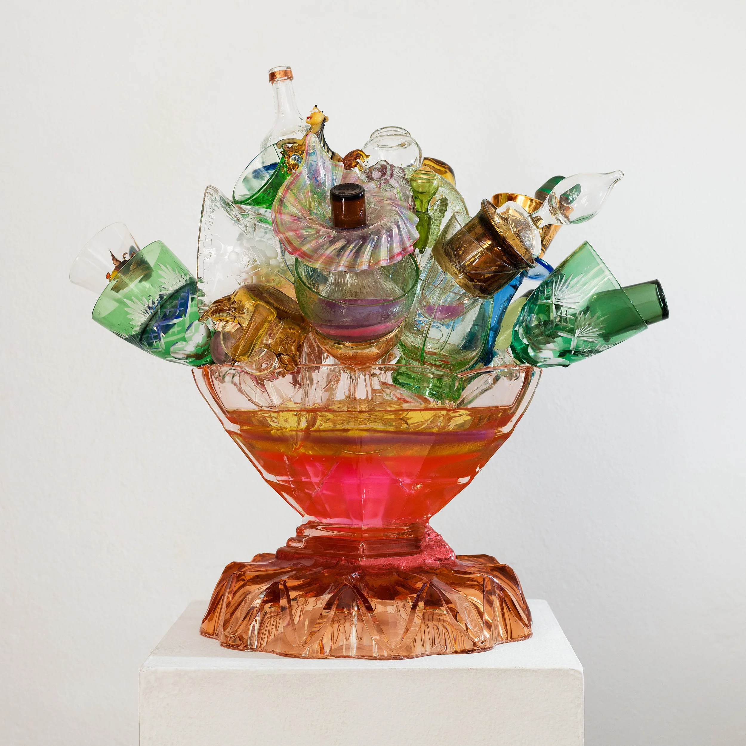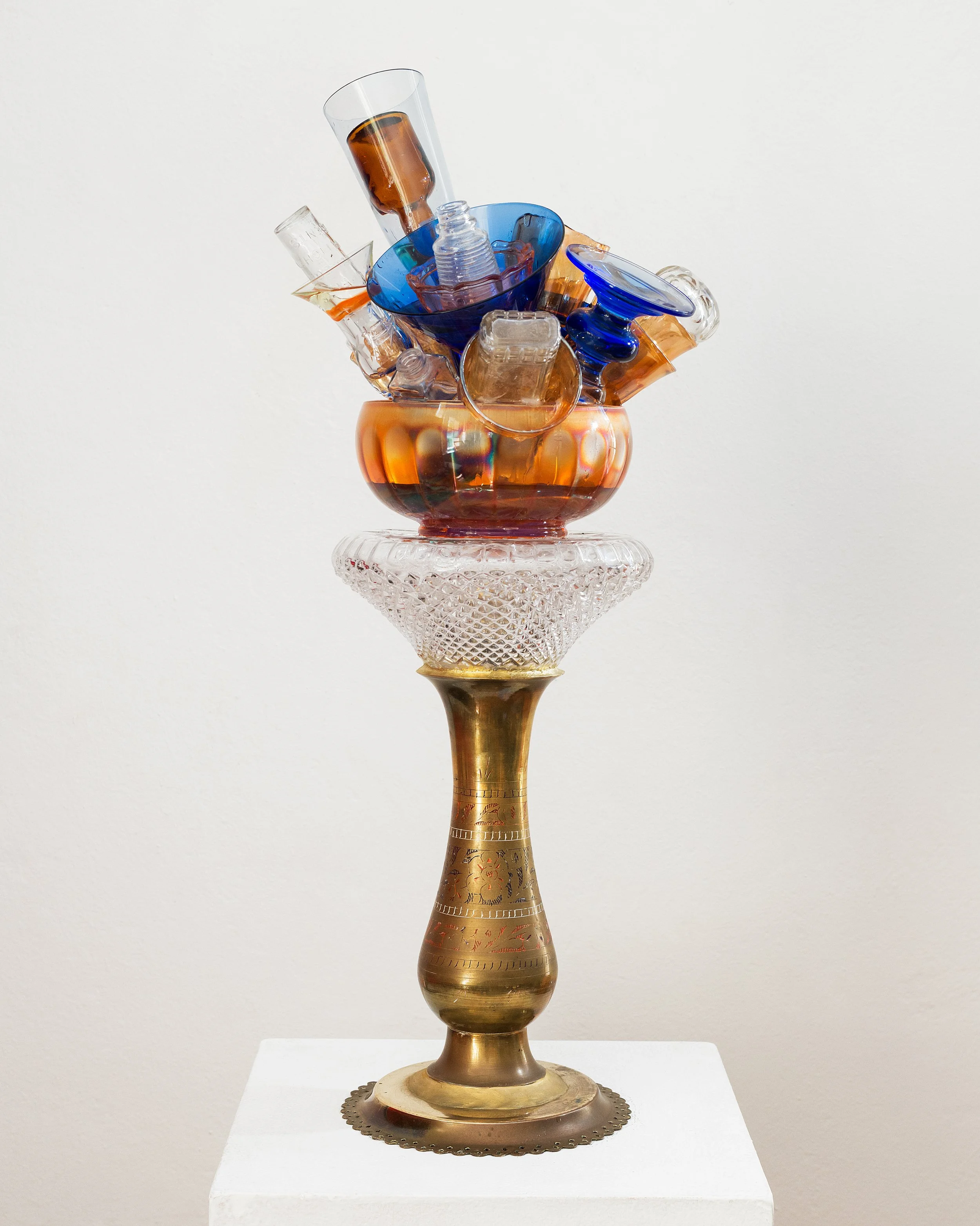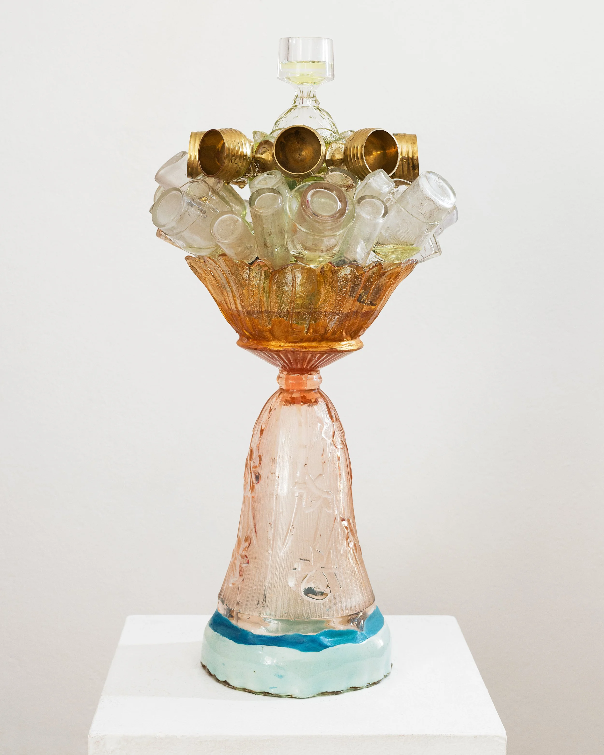 Conradie’s sculptures bring together found glass objects which have been taken out of their context of utility and suspended in a space outside of the routines of daily life. The tree structure of these assemblages leads the viewer to look beyond the history and reconsider the object as a sculpture, as an accumulation of diverse memories. Colors and shapes blur the objects’ origins and question the dimensions of the work’s perception as a piece of art. But these objects are also remains of a fraught past. They melt together to form totem-like arrangements whose layered surfaces shift between revealing and concealing the significance of each item she uses. Through their fusion, objects that initially appear cheap or commonplace become precious and even sacred. In doing so, Condradie explores the potential of meaning-making within commonplace household items and the unknowns we surround ourselves in.