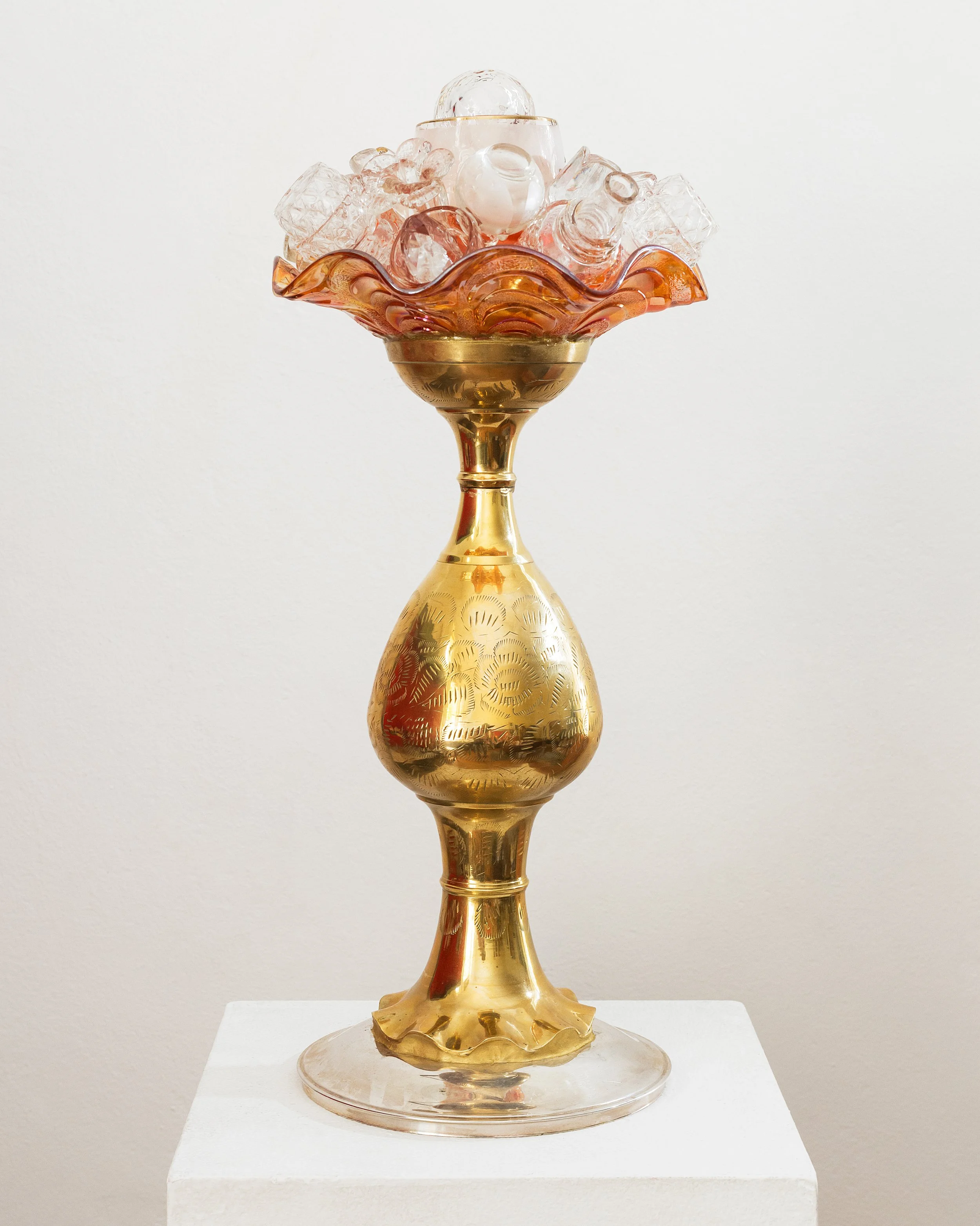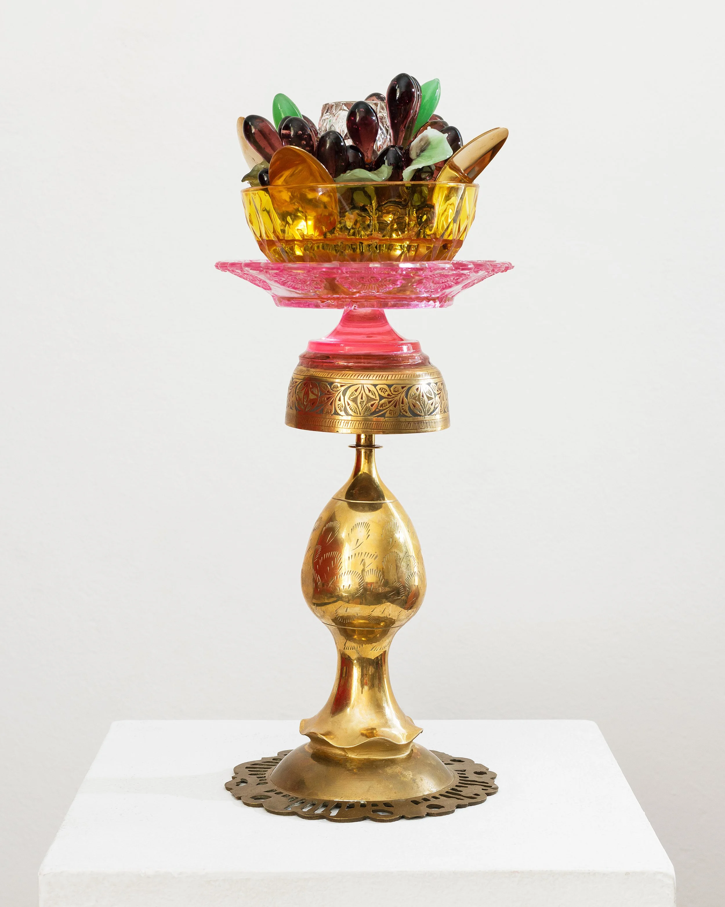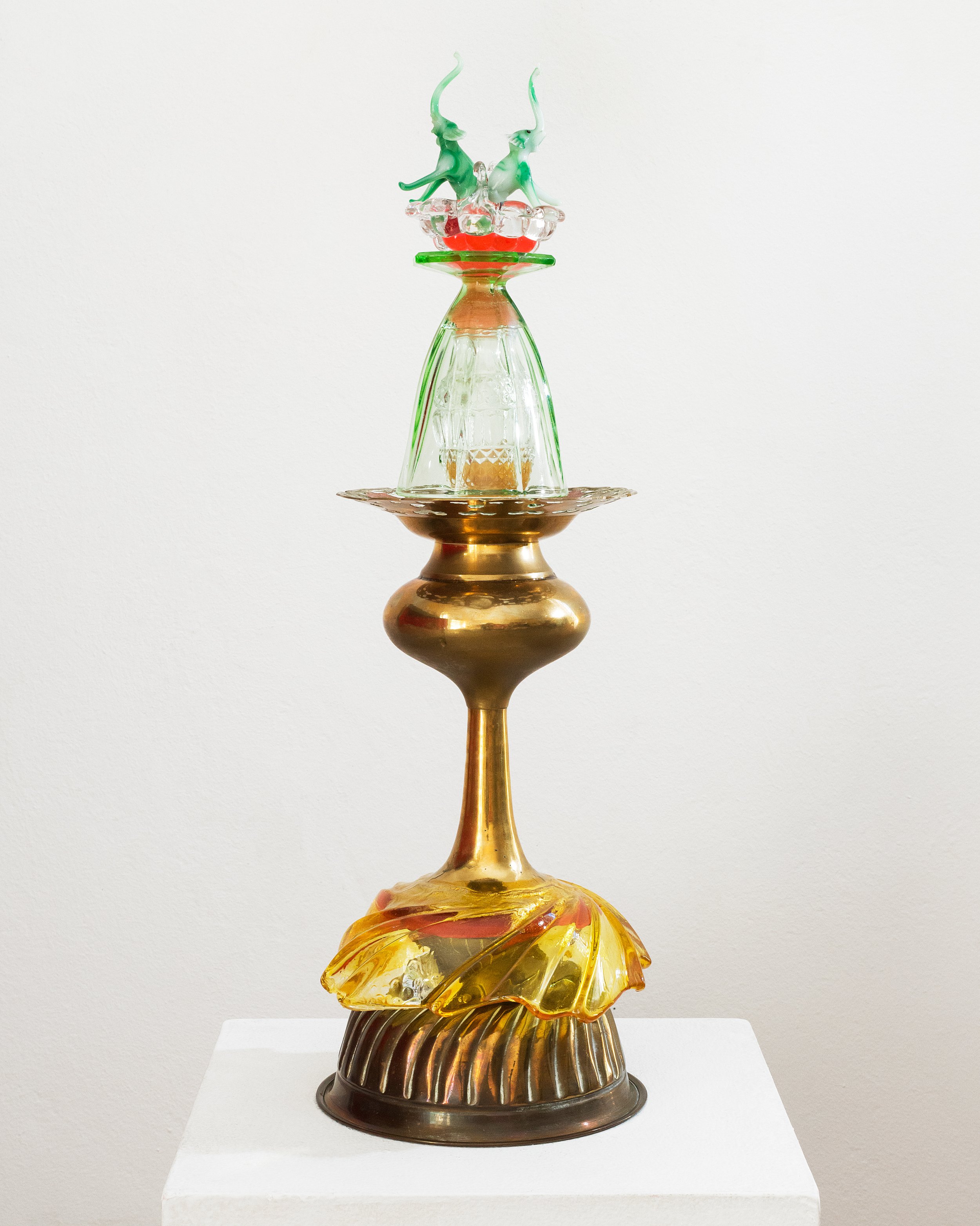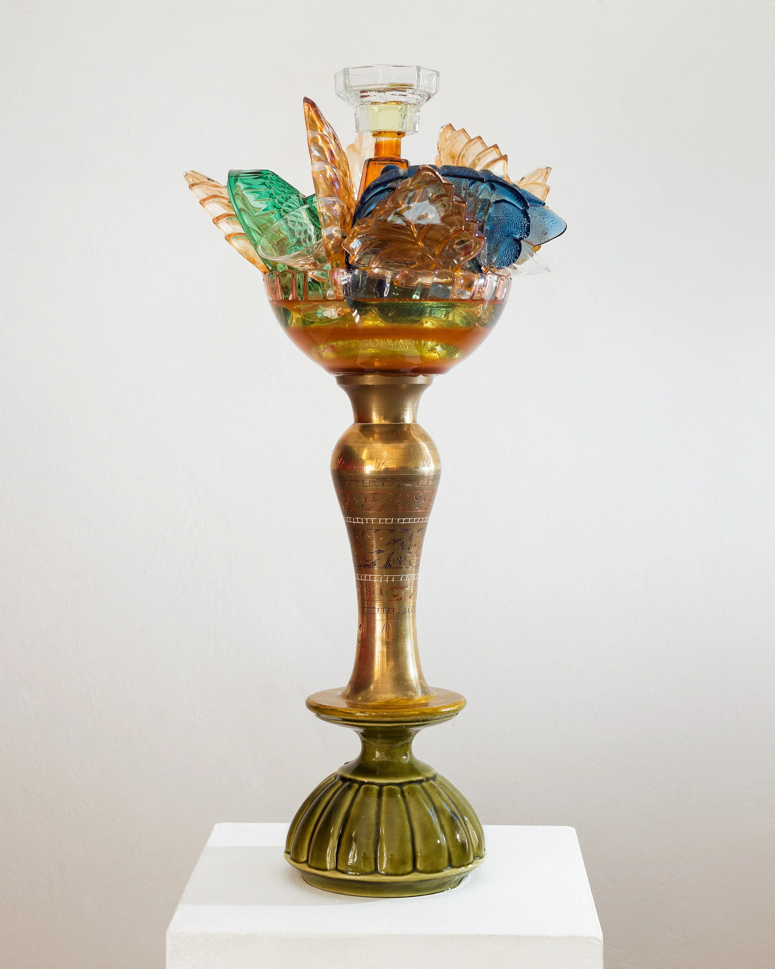 Conradie’s sculptures bring together found glass objects which have been taken out of their context of utility and suspended in a space outside of the routines of daily life. The tree structure of these assemblages leads the viewer to look beyond the history and reconsider the object as a sculpture, as an accumulation of diverse memories. Colors and shapes blur the objects’ origins and question the dimensions of the work’s perception as a piece of art. But these objects are also remains of a fraught past. They melt together to form totem-like arrangements whose layered surfaces shift between revealing and concealing the significance of each item she uses. Through their fusion, objects that initially appear cheap or commonplace become precious and even sacred. In doing so, Condradie explores the potential of meaning-making within commonplace household items and the unknowns we surround ourselves in.
